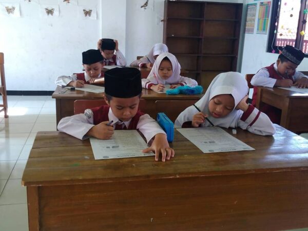 Semangat belajar agama terpancar dari wajah santriwati kelas 2 Sekolah Dasar Islam Terpadu (SDIT) Al-Fattah Kuningan saat mengikuti pembelajaran fikih..