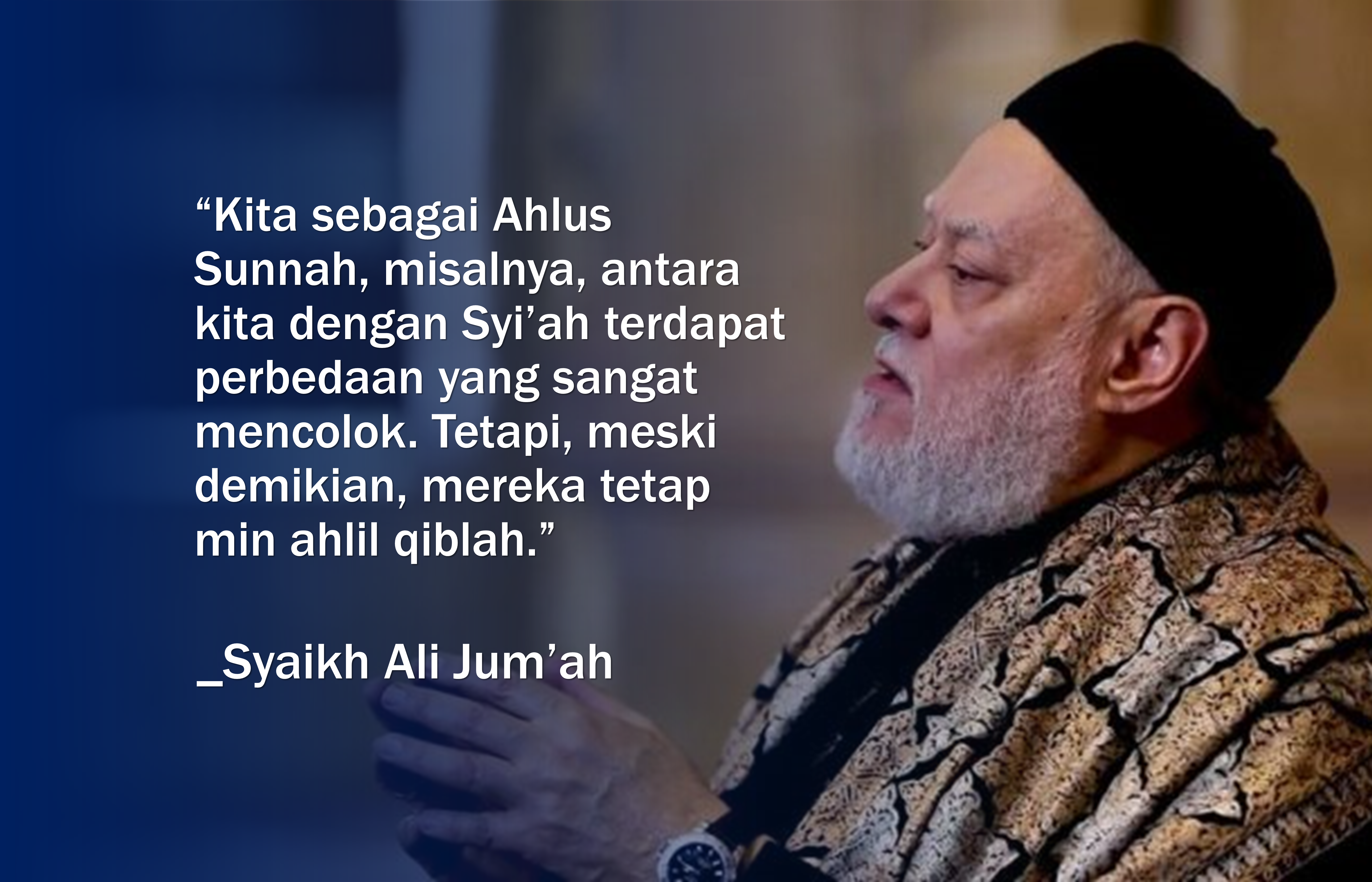Syaikh Ali Jum’ah menjawab, “Umat Muslim itu bersatu. Kiblat kita sama. Nabi kita sama. Kitab kita sama. Bulan puasa kita sama. Perjalanan haji sama. Tak perlu ada paradigma ‘upaya menyatukan umat Muslim.’ Adapun yang terjadi saat ini adalah perbedaan pendapat yang tak keluar dari bingkai Islam bagaimanapun tajamnya.